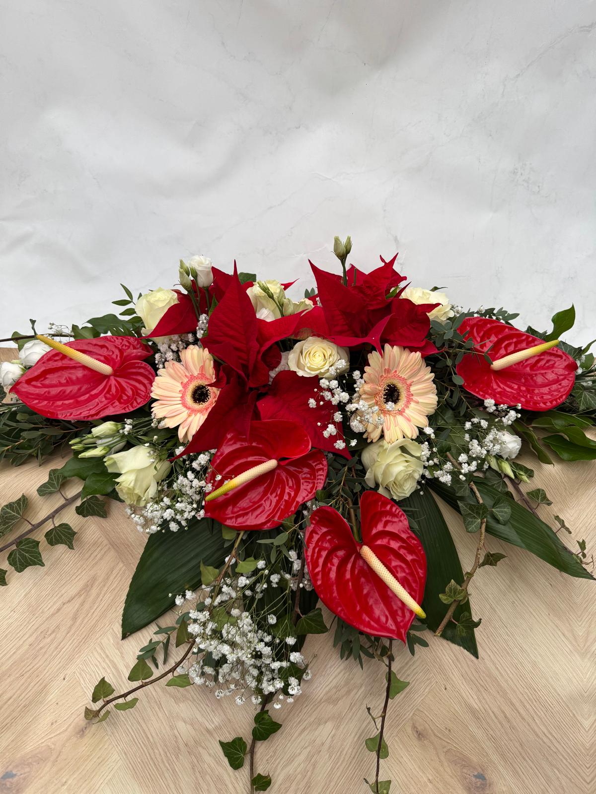 Arrangement à poser sur table, composé de poinsettia, d’anthurium et gerbera