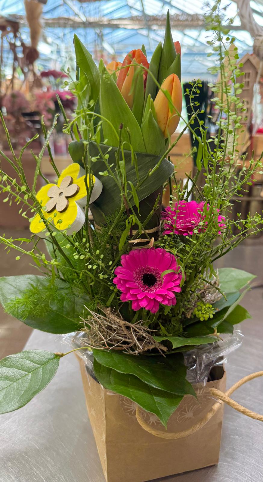 Bouquet composé de tulipes, germini et verdures, en sac kraft avec réserve d’eau