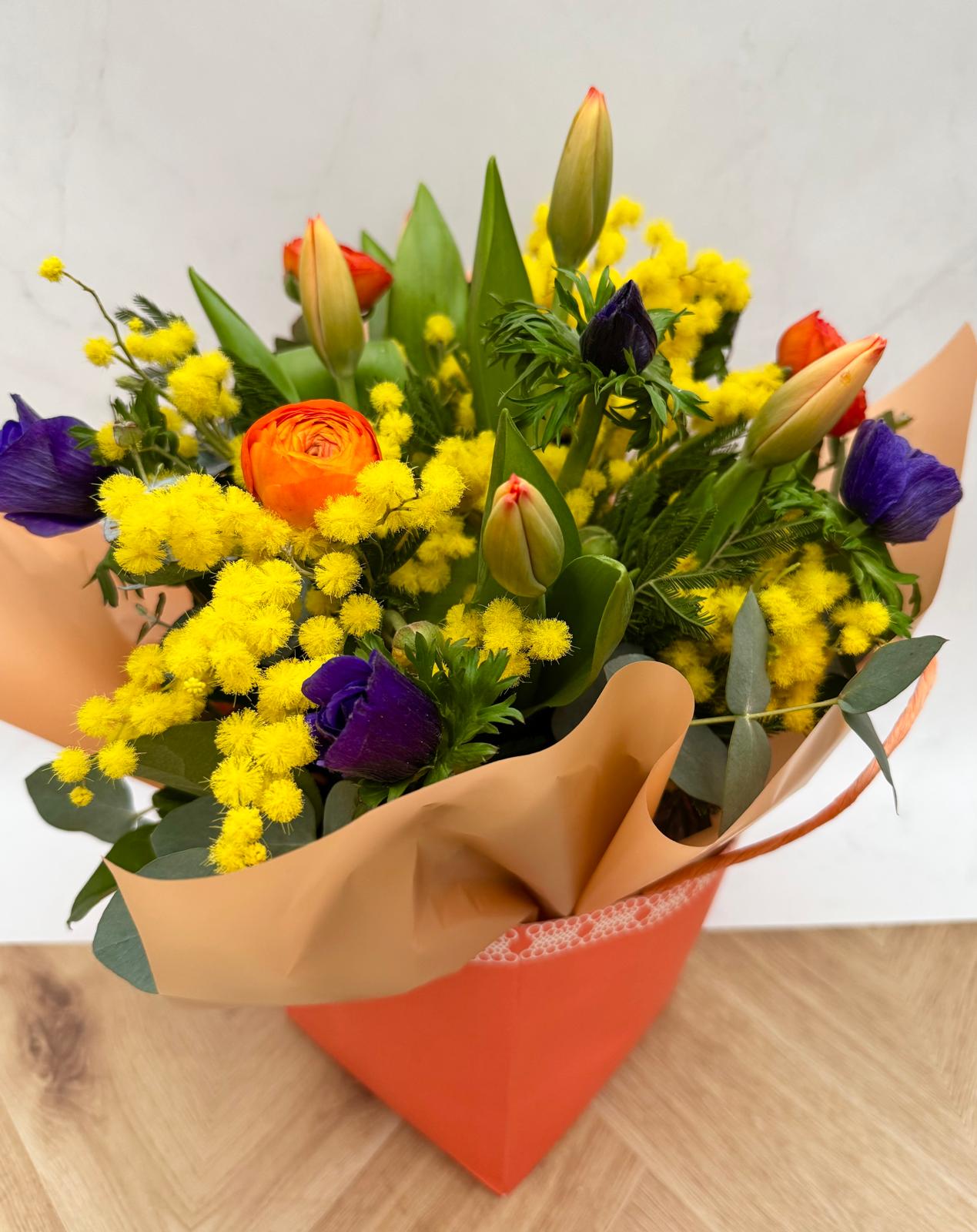 Bouquet avec réserve d’eau composé de tulipes, anémones, renoncules et mimosa