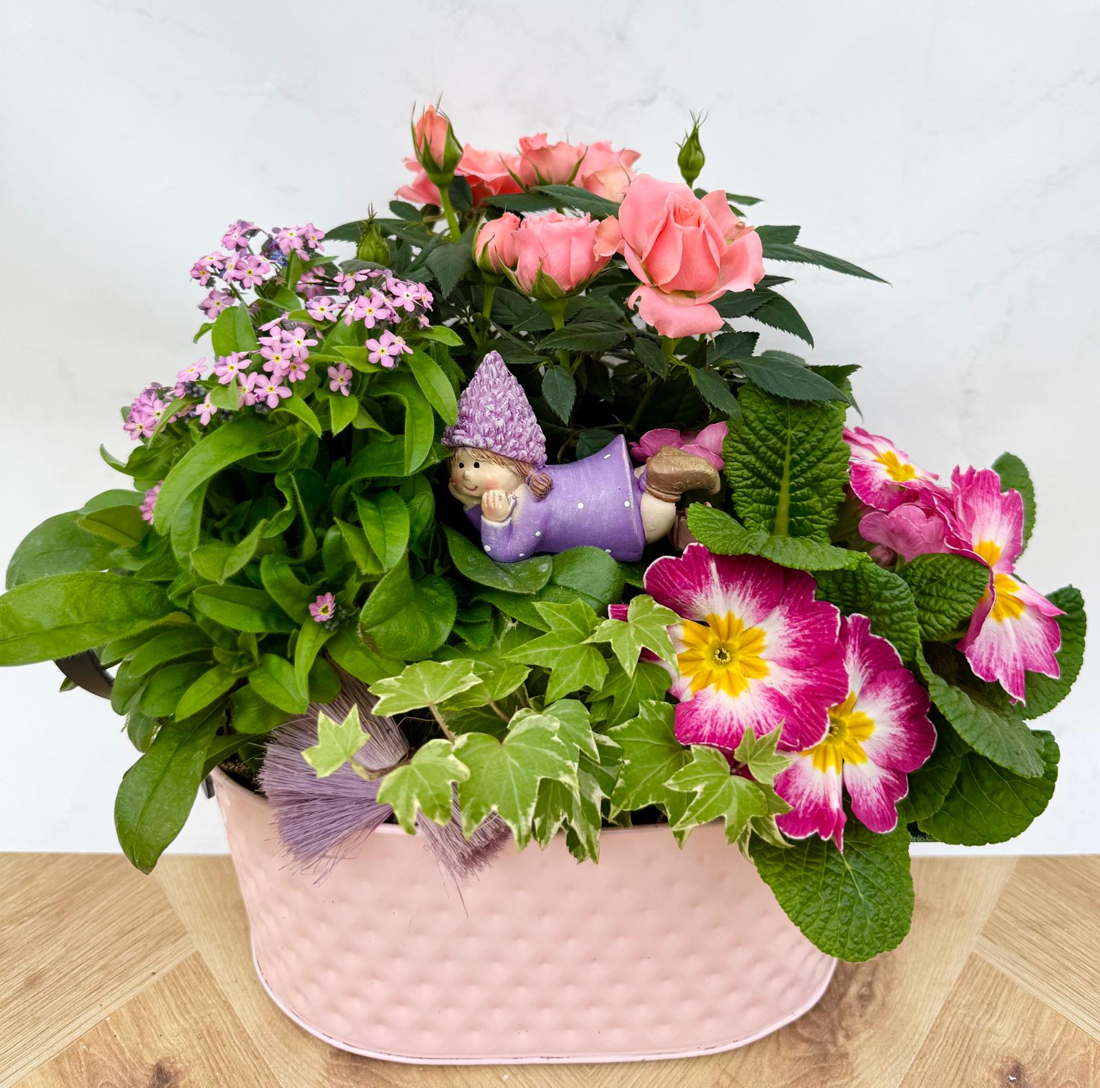 Rosier, Myosotis, Primevère, dans un contenant zinc largeur 30cm environ
