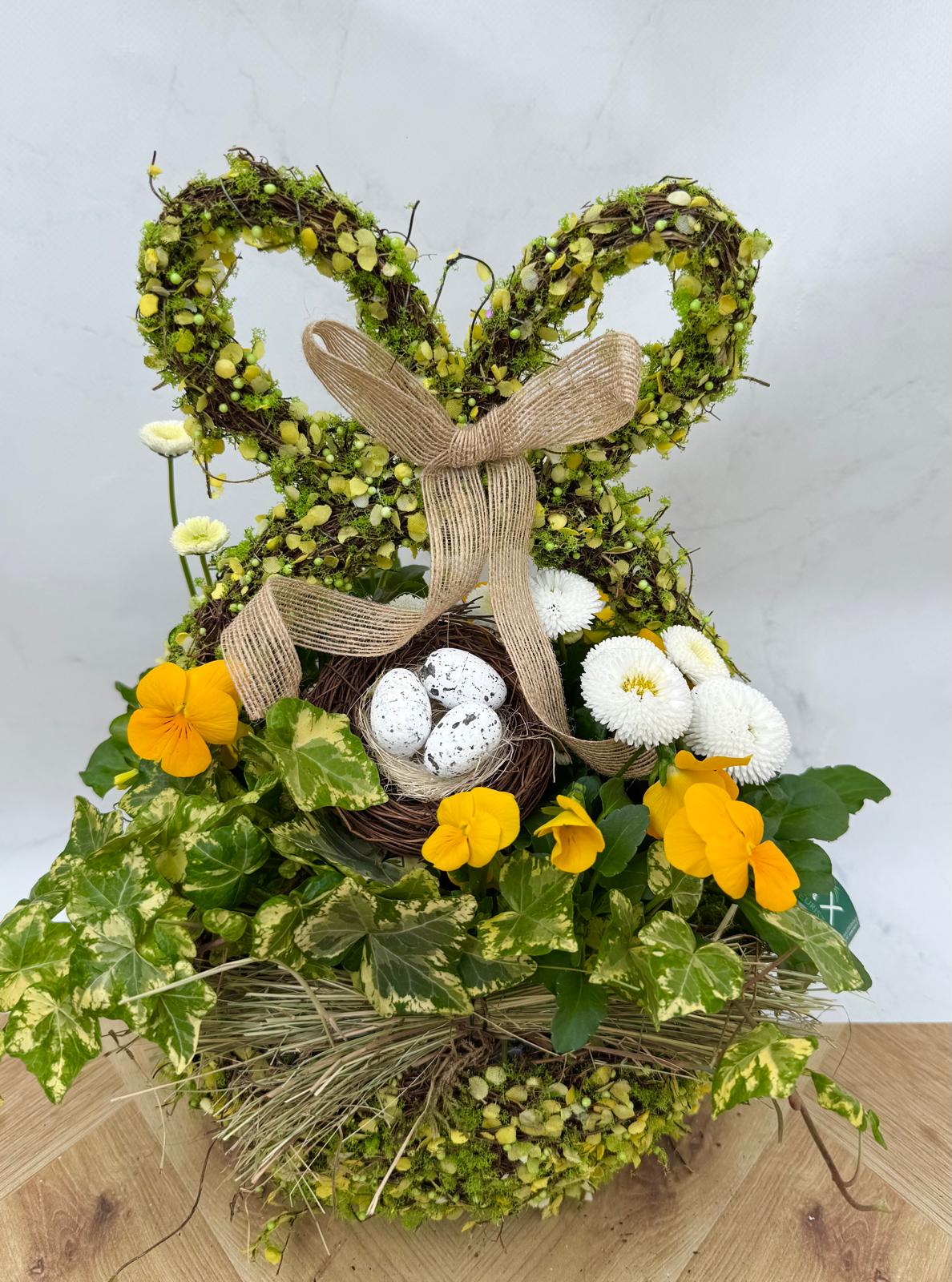 Pensées et pâquerettes dans un contenant plastic hauteur 30cm environ