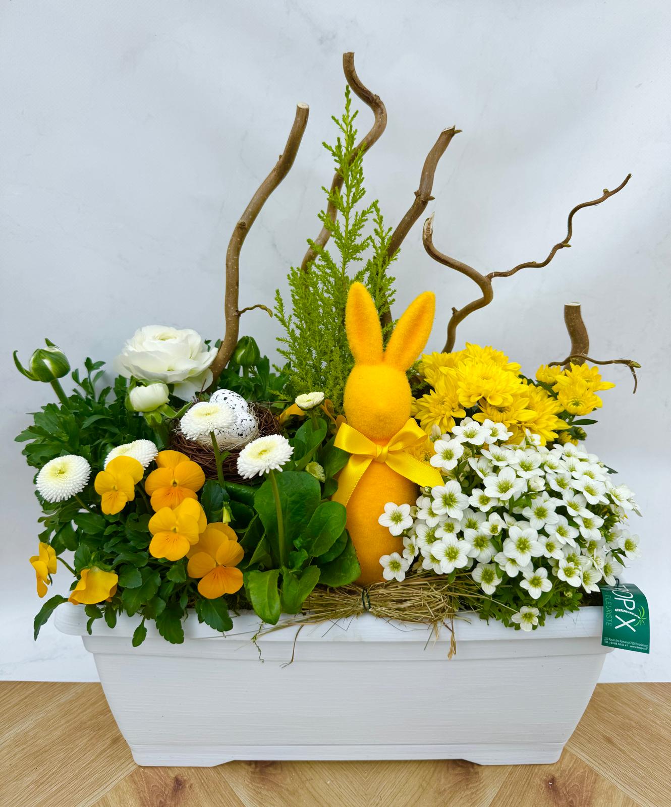 Renoncules, Pensées et pâquerettes dans un contenant plastic Largeur 40cm environ