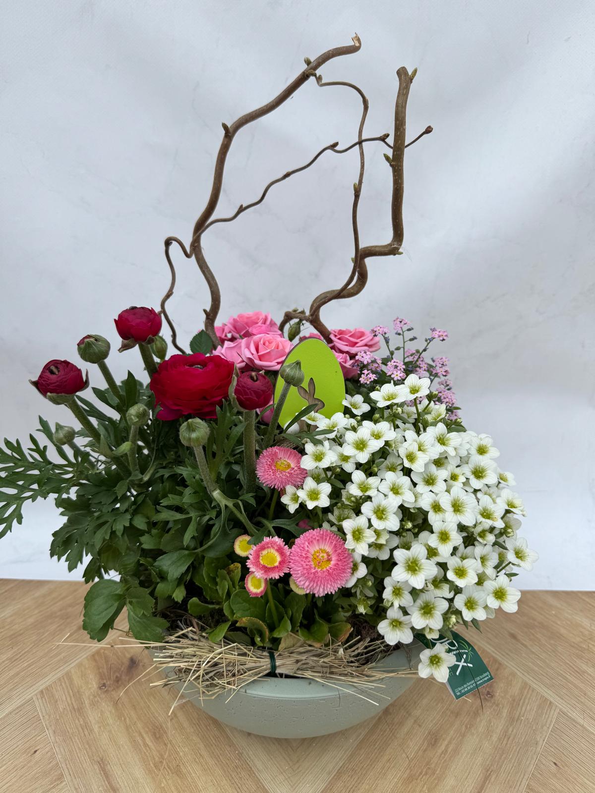 Saxifrages, renoncule, rosier et pâquerettes dans un contenant plastique 25cm environ