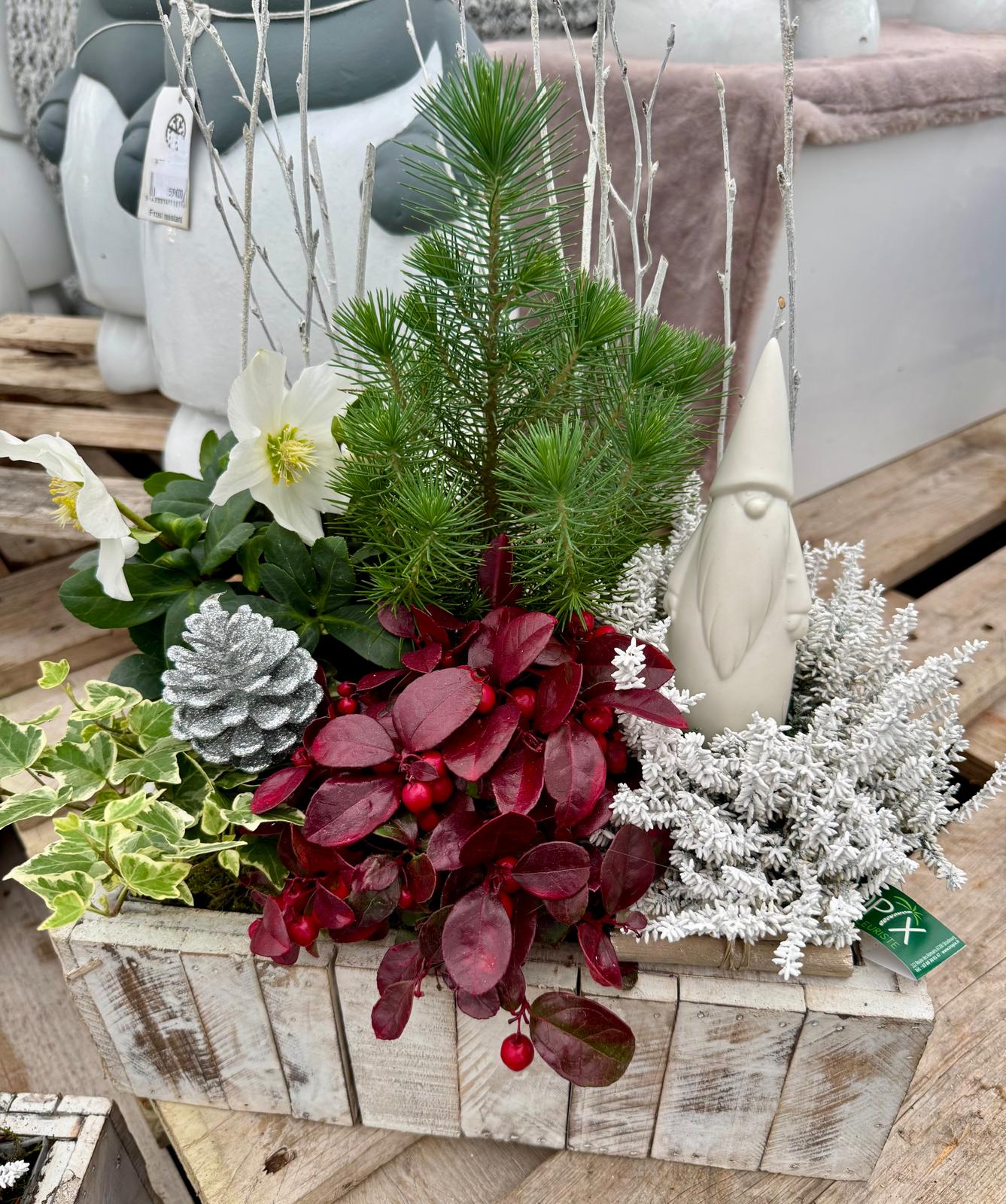 Composition avec Rose de Noel, autres plantes extérieures, décorations, jardinière en bois