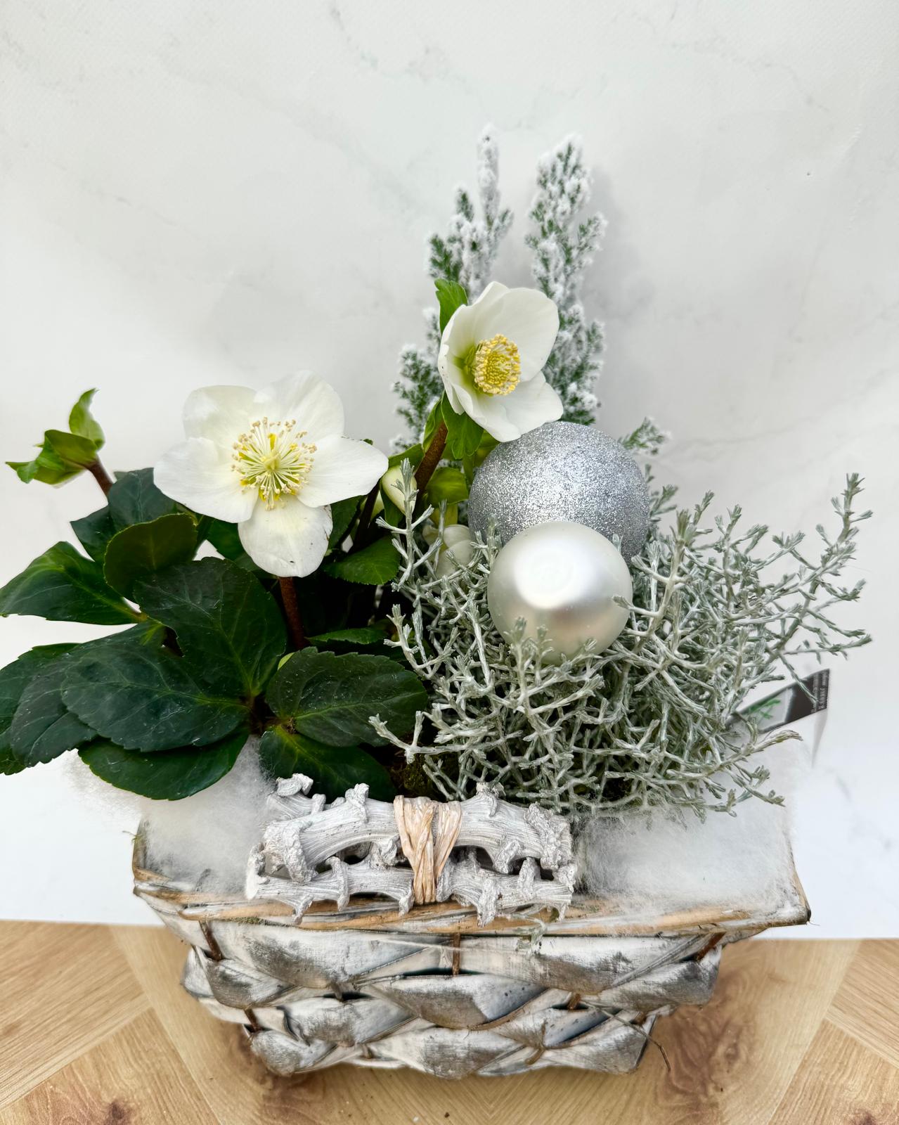 Composition avec hellébore, autres plantes extérieures, décorations, contenant bois 25cm