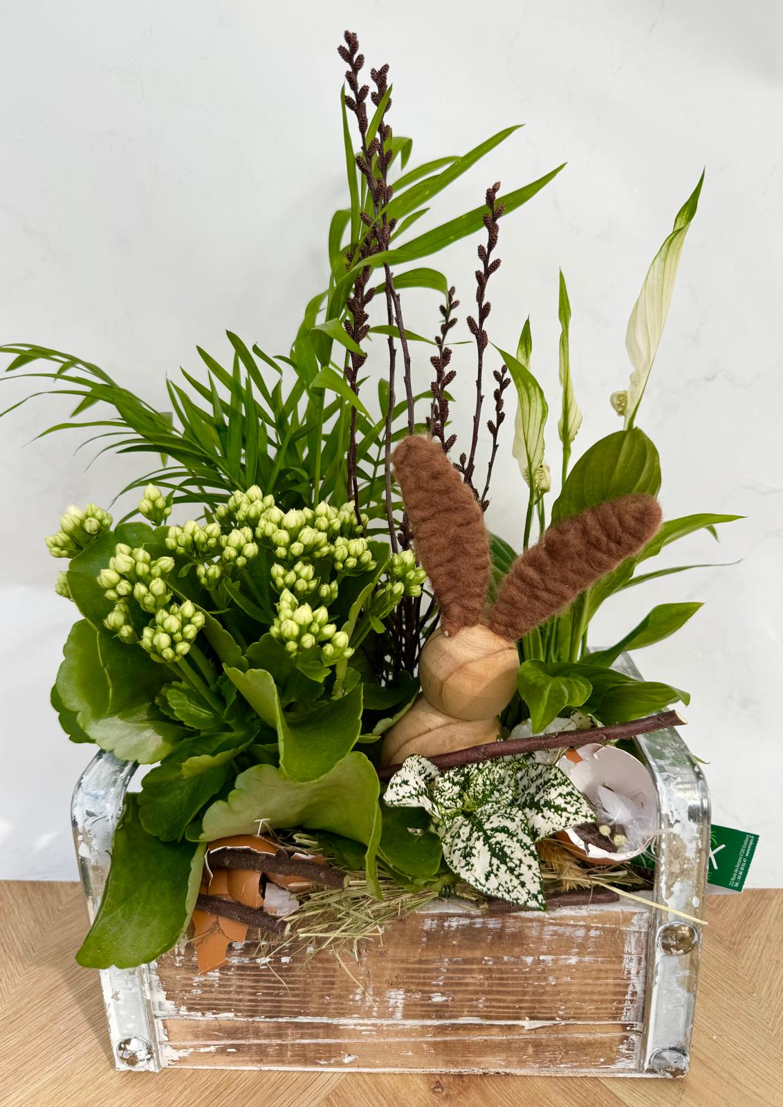 Spatiphyllum, Kalanchoe, plantes vertes, dans un contenant en bois, Largeur 25 cm 20 cm Hauteur 30 cm environ