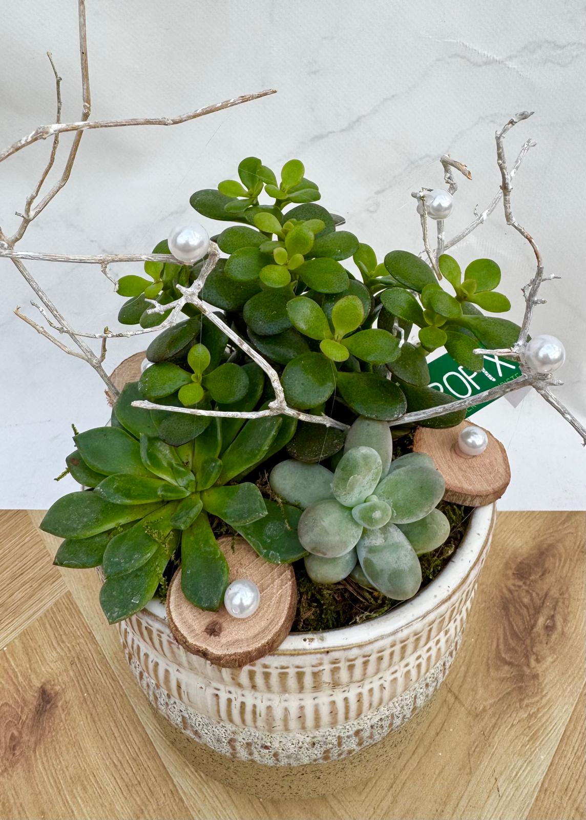 Composition de plantes grasses ,décorations, pot en céramique, diamètre 15cm