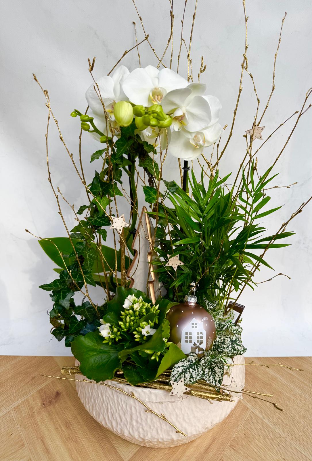 Composition avec 1 orchidée , lierre , plantes vertes et décoration de Noel