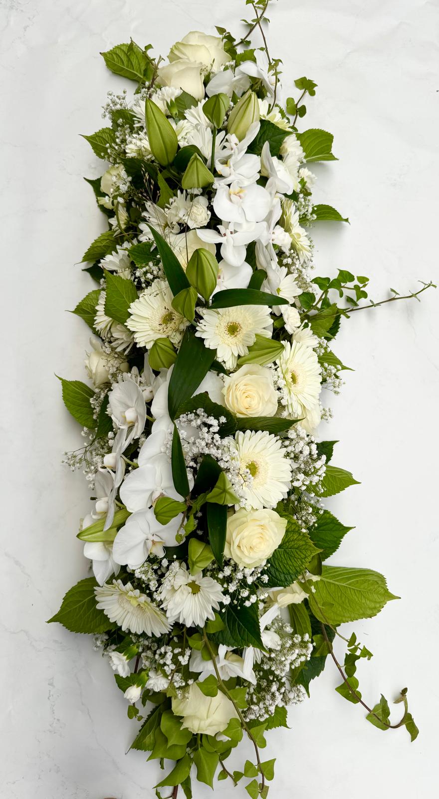 Dessus de cercueil blanc à base de roses, gerbera, lys et orchidées