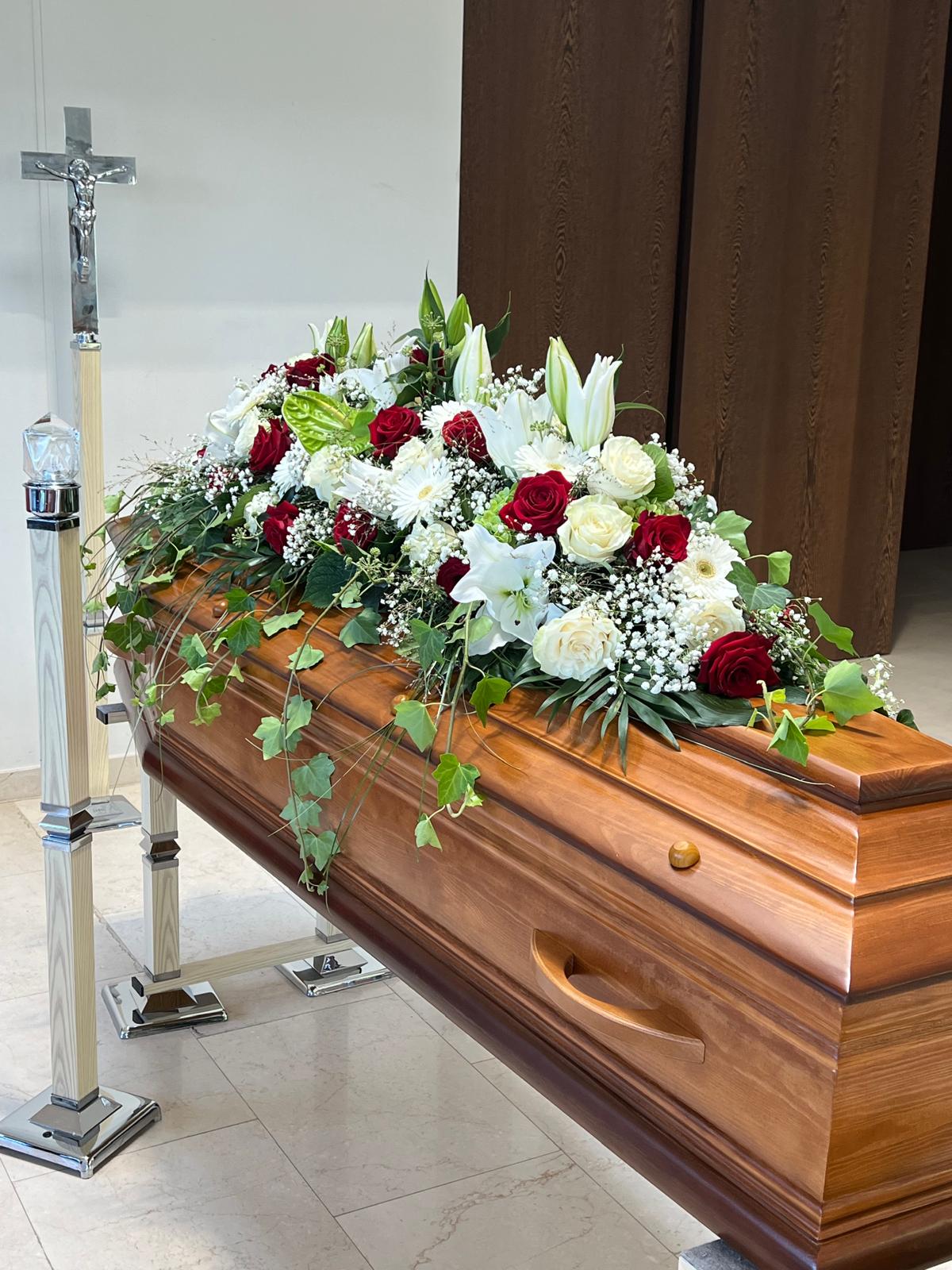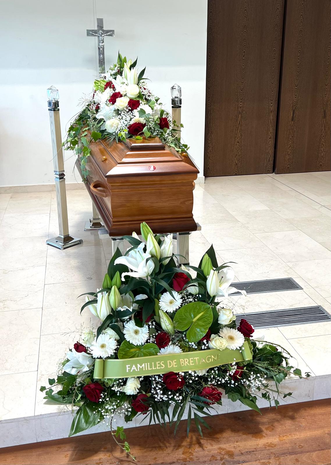 Dessus de cercueil blanc à base de roses,lys et gypsophile