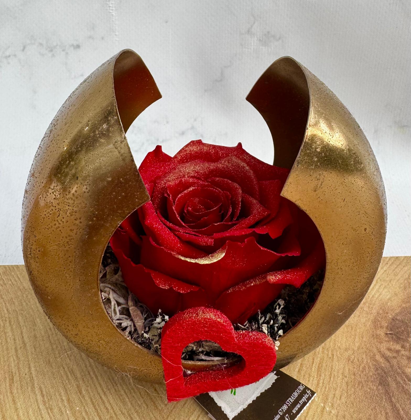 Composition avec bouton de rose rouge éternelle, contenant métal doré hauteur 15cm environ