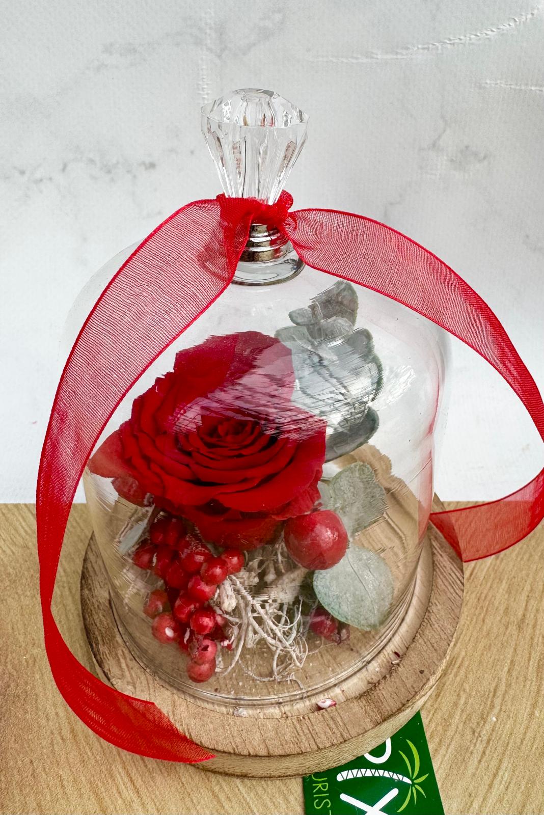 Composition avec bouton de rose rouge éternelle, cloche verre hauteur 15cm environ