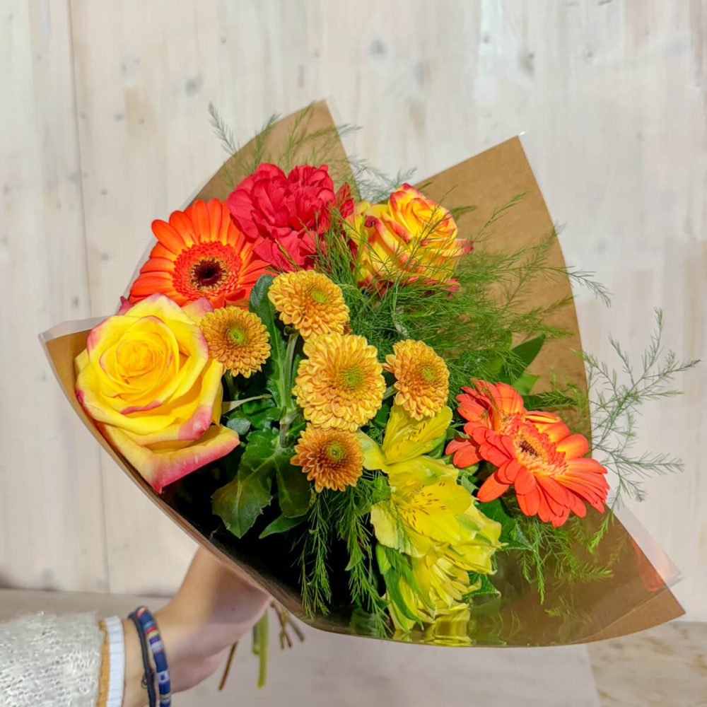 Bouquet longues tiges couleur orangé pour toutes les occasions, petit budget, base de 5/7 fleurs avec roses, germini, oeillets et altroemeria